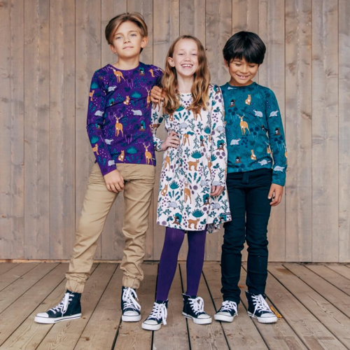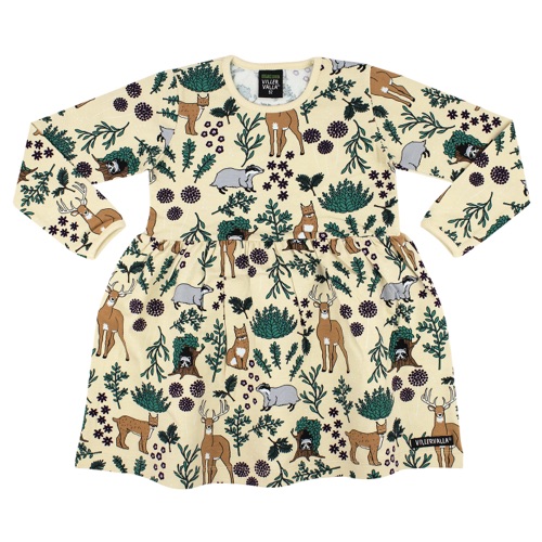 Villervalla Autunno 2025 arriva con un botto! Colori strepitosi, stampe super, senza mai rinunciare alla qualità garantita Villervalla. Abito manica lunga Winter Forest beige, stampa bellissima con degli animali del bosco
