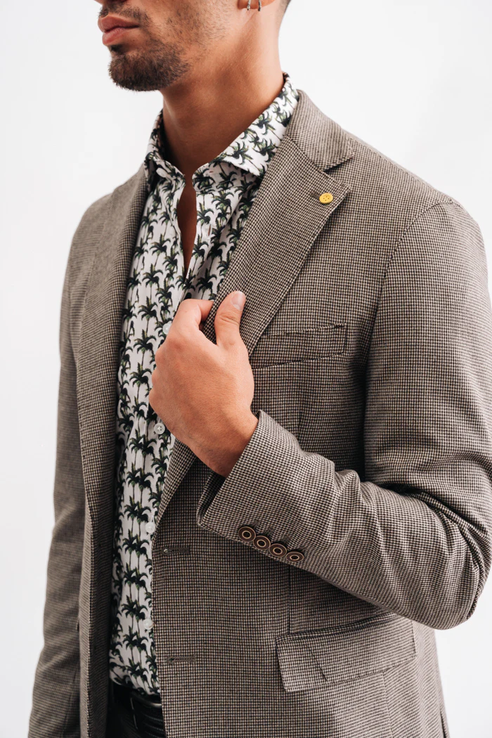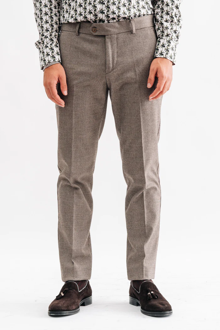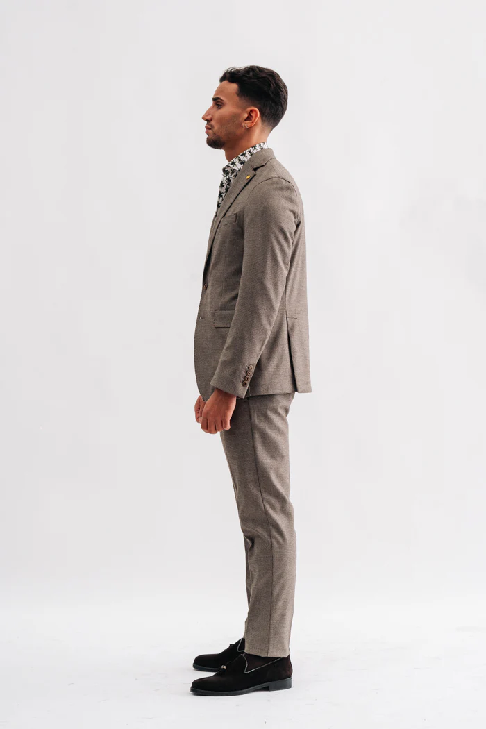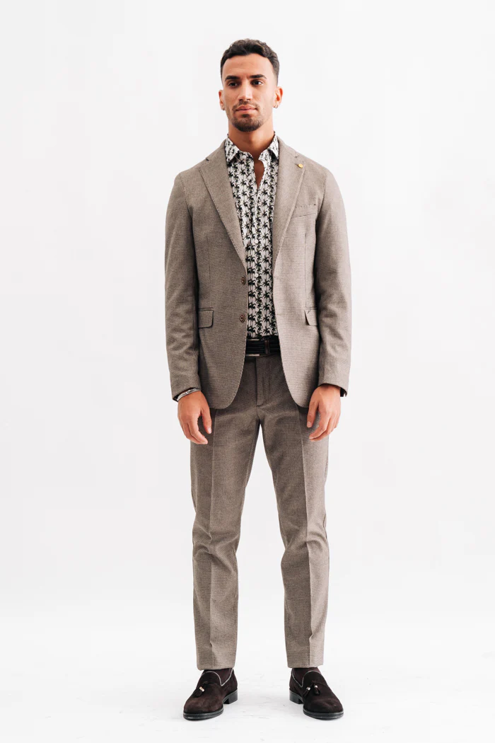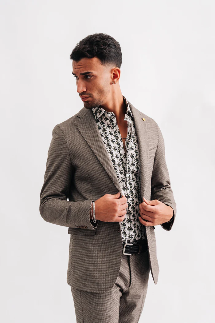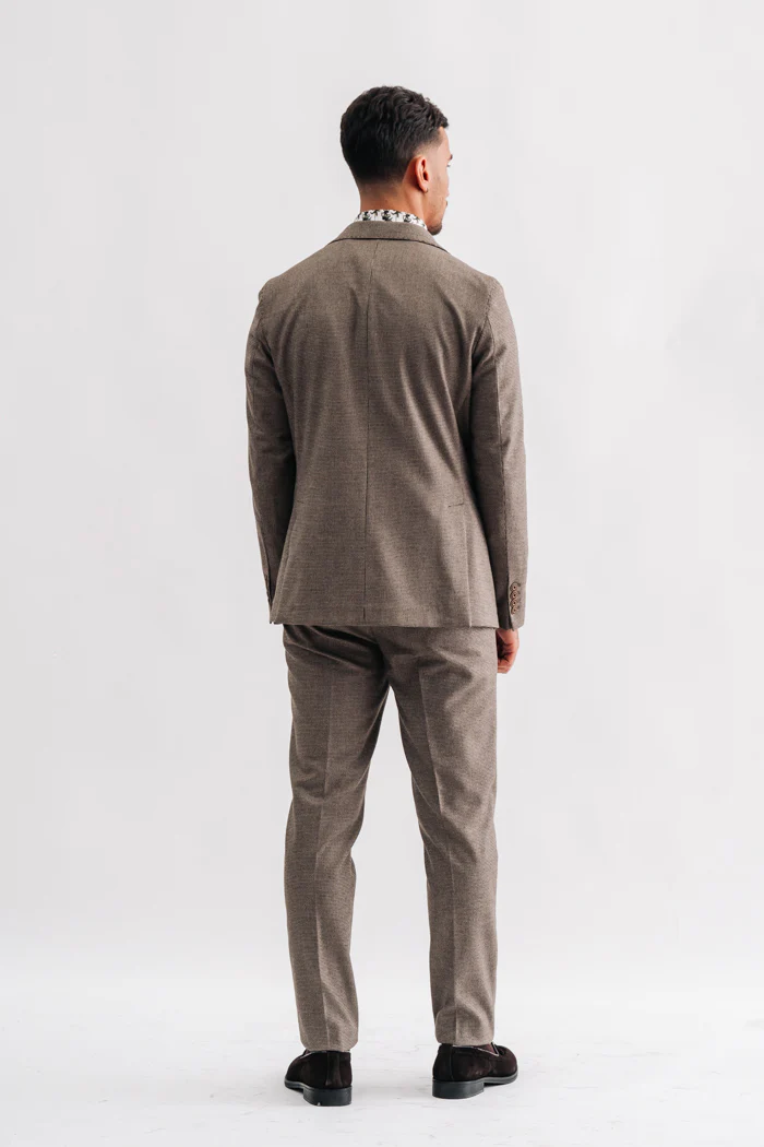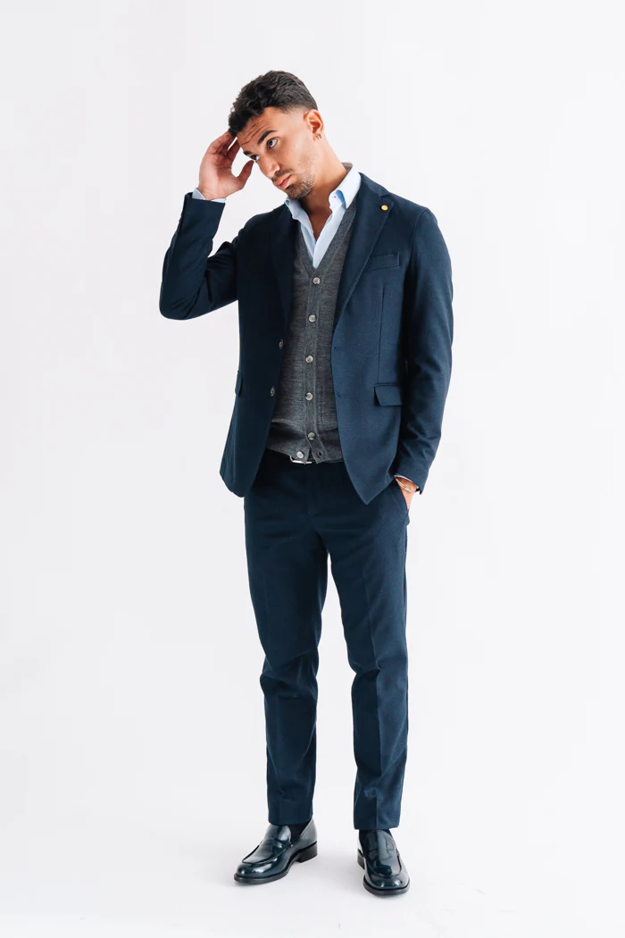 Abito disegno pied de poule Chiusura a 2 bottoni Tasche a pattina e taschino su petto a sinistra. Bavero classico, con occhiello a sinistra. Polsino con quattro bottoni e asole aperte, doppio spacco sul retro. Interamente sfoderato all’interno Pantalone disegno pied de poule, taglio regular fit Chiusura con cerniera nascosta da patta e bottone Due […]
