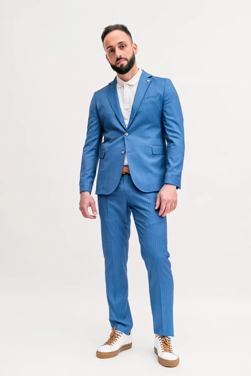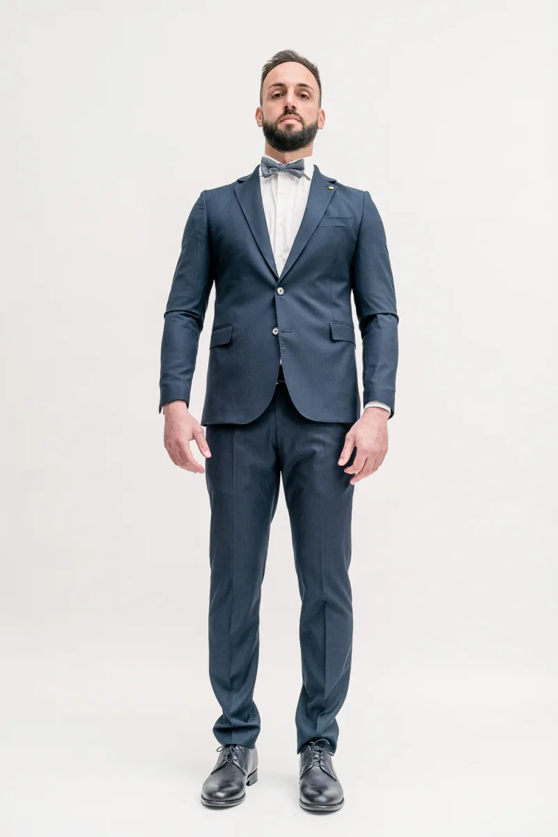 Abito tinta unita con trama spigata due bottoni tasca pattina e taschino su petto a sinistra. Bavero classico con occhiello a sinistra Polsino con quattro bottoni doppio spacco sul retro tasche e fodera all’interno pantalone tinta unita con trama spigata taglio regular fit chiusura con cerniera nascosta da patta e bottone due tasche laterali due […]