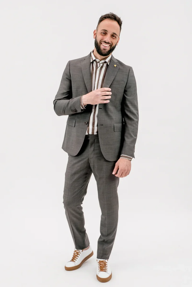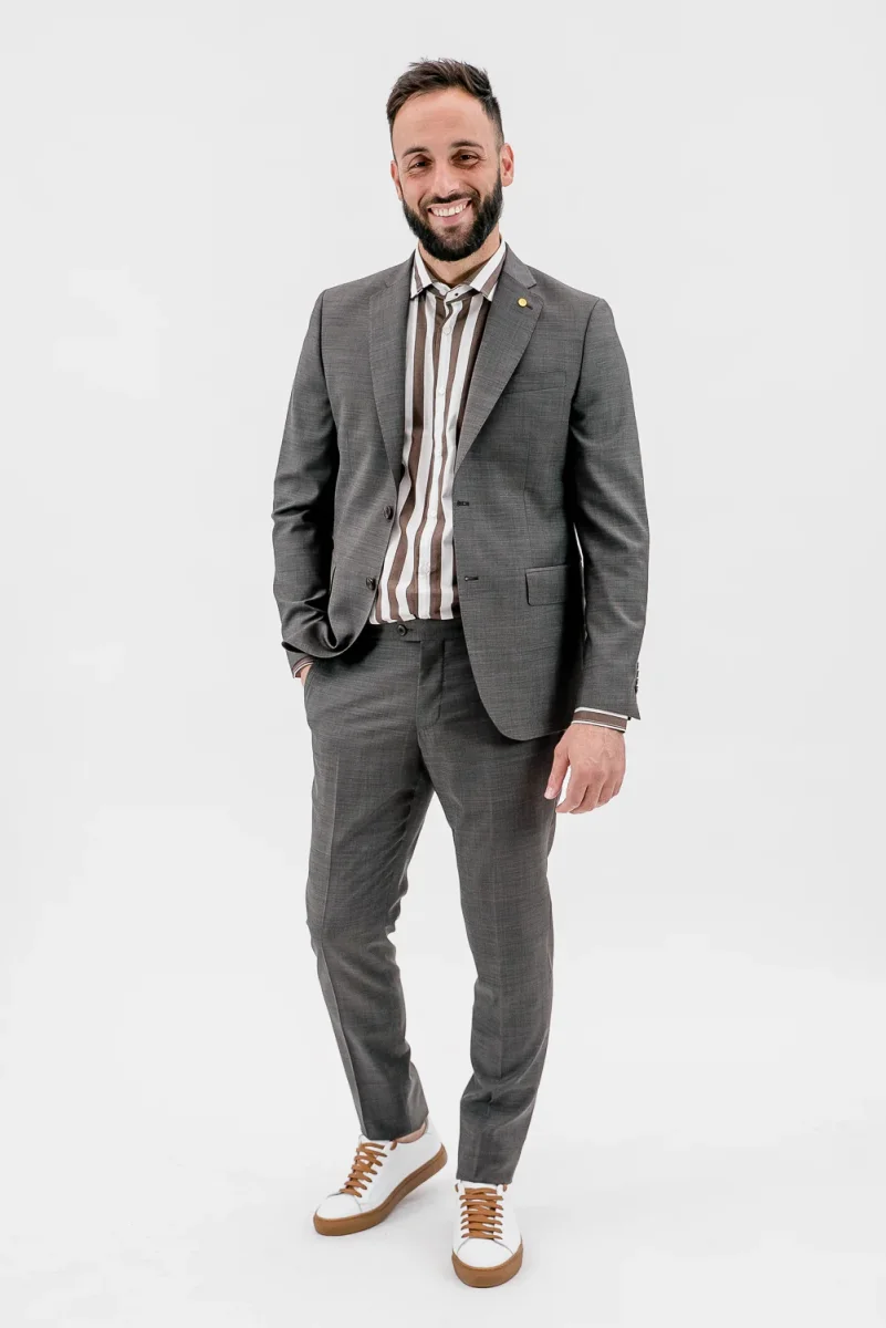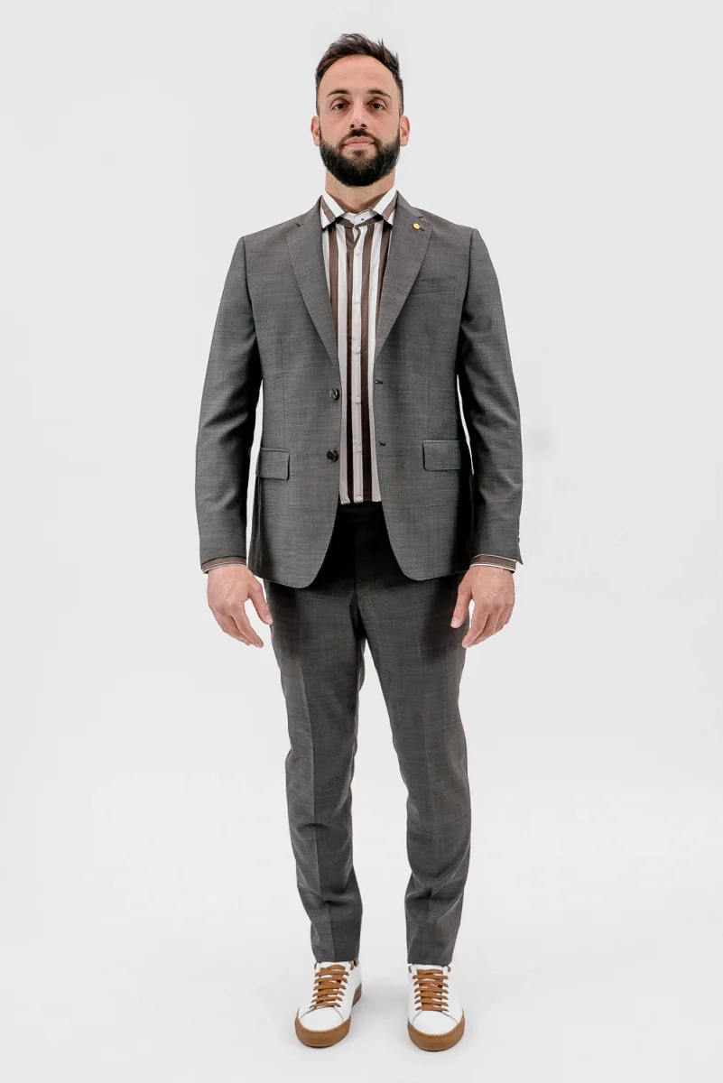 Abito tinta unita Chiusura a 2 bottoni Tasche con pattina e taschino su petto a sinistra. Bavero classico con occhiello a sinistra. Polsino con quattro bottoni, doppio spacco sul retro. Fodera e tasche all’interno Pantalone tinta unito, taglio regular fit Chiusura con cerniera nascosta da patta e bottone Due tasche laterali, due tasche a filetto […]