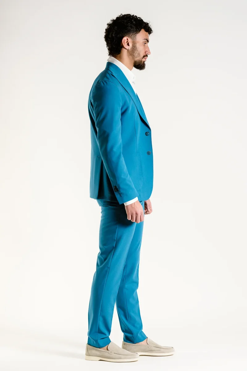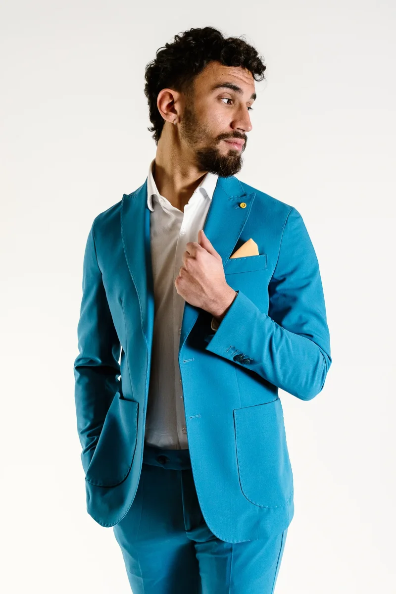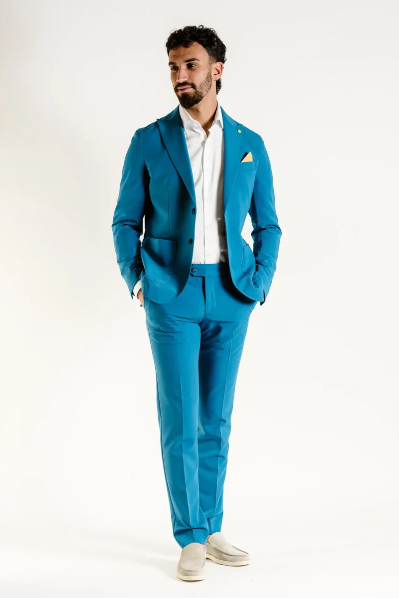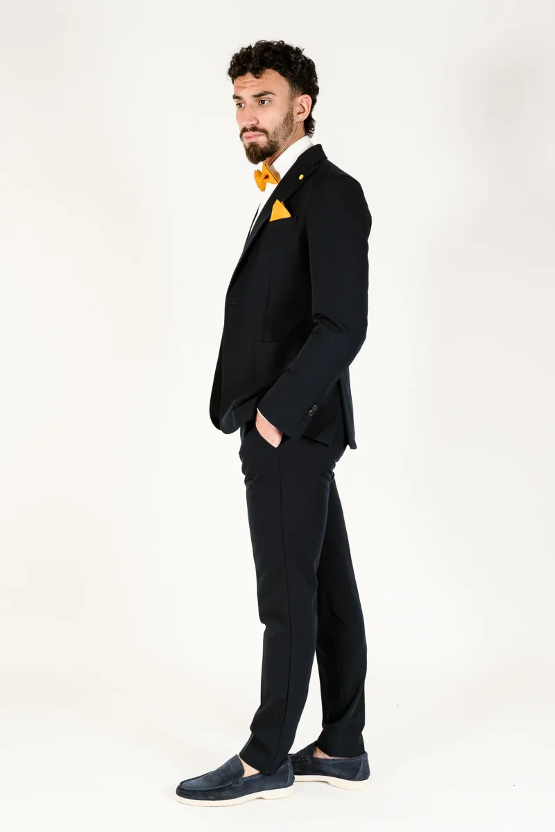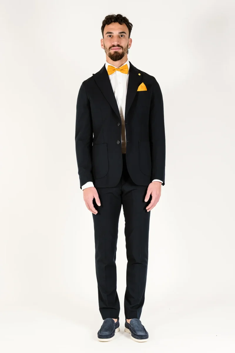 Abito tinta unita Chiusura a 2 bottoni Tasche a toppa e taschino su petto a sinistra Bavero largo 8cm , con occhiello a sinistra Polsino con quattro bottoni e asole aperte , doppio spacco sul retro Interamente sfoderato all’interno Pantalone tinta unita , taglio regular fit Chiusura con cerniera nascosta da patta e bottone Due […]