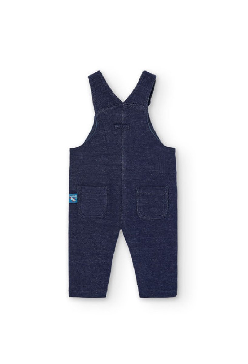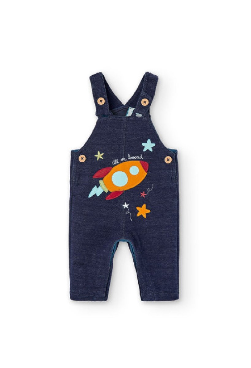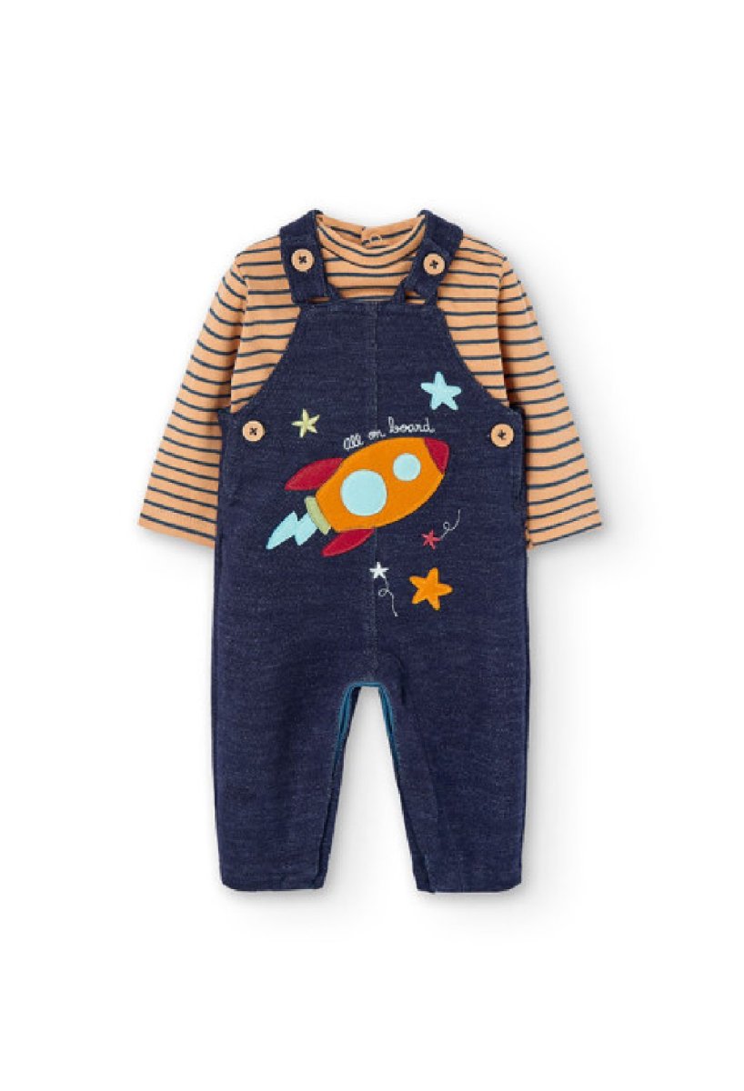 Set di maglietta e salopette per neonato maschio. La maglietta è a righe interlock in arancione e blu. Ha un collo alto e si chiude sulla schiena con bottoni a pressione. Come decorazione ha un’etichetta con il dettaglio del marchio. La salopette è in felpa denim blu con un posizionamento di un razzo e stelle con applicazioni in diversi colori sulla parte anteriore. Si chiude con bottoni sulle bretelle e bottoni a pressione sul cavallo. Disponibile dalla taglia 0 mesi ai 2 anni.