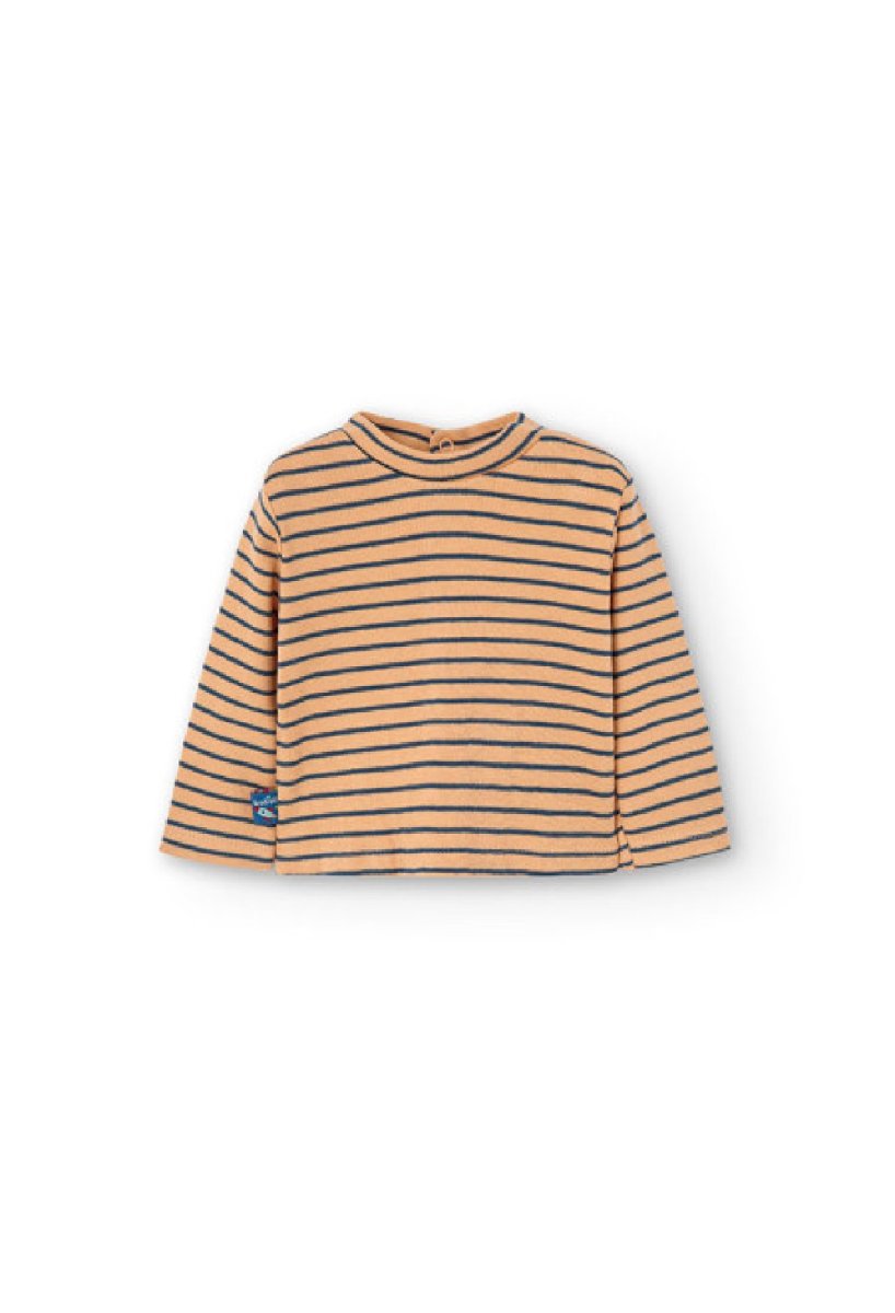 Set di maglietta e salopette per neonato maschio. La maglietta è a righe interlock in arancione e blu. Ha un collo alto e si chiude sulla schiena con bottoni a pressione. Come decorazione ha un’etichetta con il dettaglio del marchio. La salopette è in felpa denim blu con un posizionamento di un razzo e stelle […]
