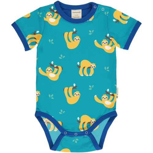 Maxomorra Estate – una garanzia di colori che brillano al sole! Body manica corta con dei Bradipi simpatici sullo sfondo verde/azzurro Cotone organico 95% elastan 5%