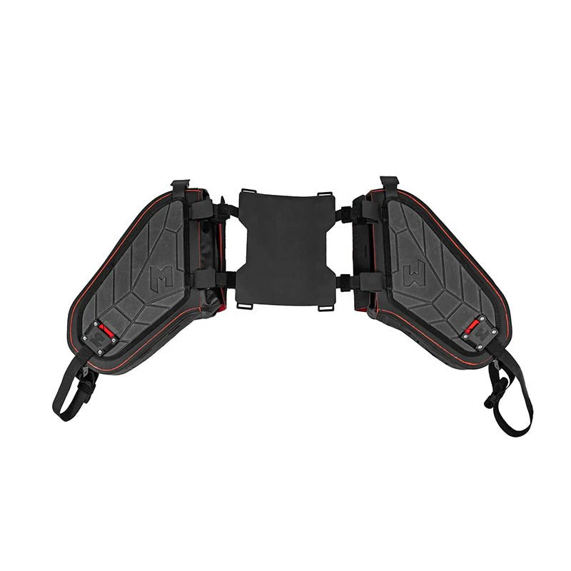 Nelle borse tradizionali, le cinghie di fissaggio anteriori spesso si strappano durante cadute violente. Questo tipo di danno è quasi impossibile da riparare sul posto e spesso compromette l’impermeabilità delle borse. Le forze generate durante una caduta in fuoristrada possono raggiungere centinaia di chilogrammi, rendendo difficile evitare danni alla borsa o addirittura alla moto.