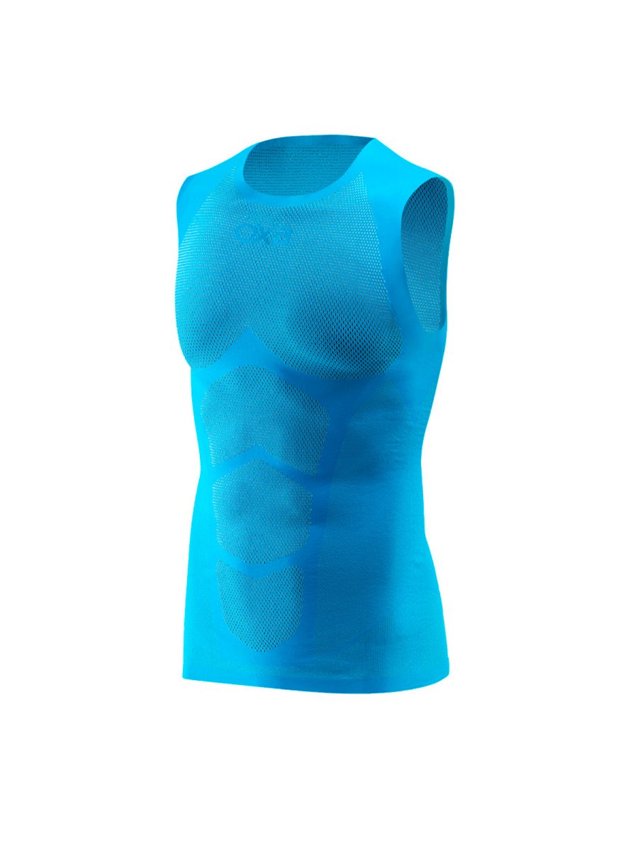 Canotta uomo con tessuto ultraleggero in grado di mantenere il perfetto microclima corporeo. La struttura a microrete auto ventilante accelera la traspirazione del sudore lasciando il corpo asciutto. La totale assenza di cuciture e le finiture a taglio vivo generano una sensazione di comfort assoluto.