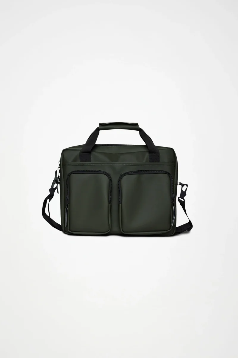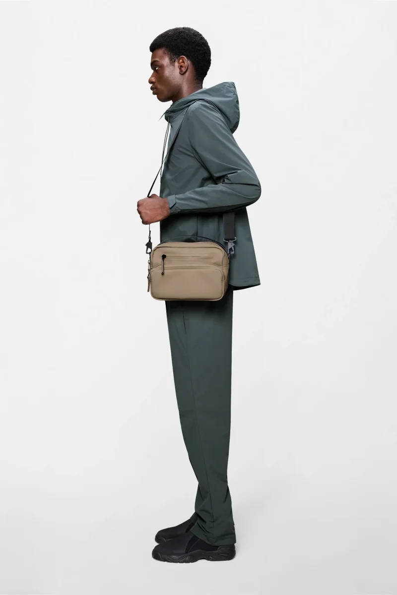 La Cargo Box Bag è realizzata nell’iconico tessuto PU di Rains, progettato per essere robusto, duraturo e piacevole al tatto.