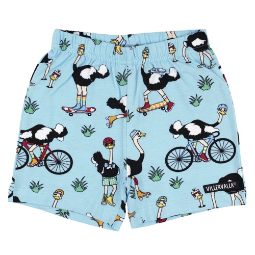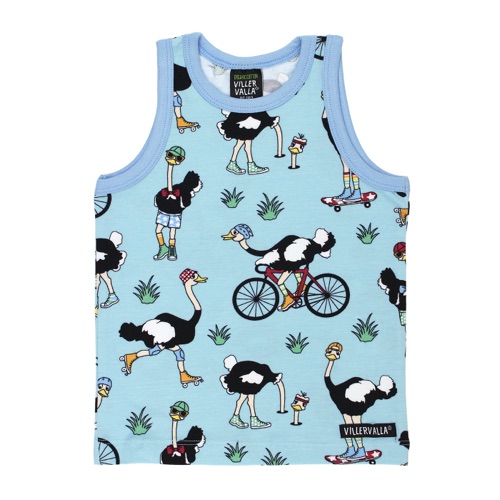 Vi presentiamo Villervalla primavera – La prima collezione primaverile dell’anno 2025 ci porta una ventata di colore e allegria! Completo canotta + shorts Struzzi in bicicletta, sullo sfondo azzurro