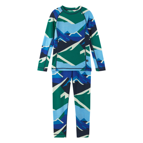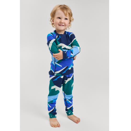 Bellissimo completo caldo in lana merino composto da maglietta e pantaloni sulle tonalitĂ  del blu in stampa che ricorda le montagne innevate. La morbidezza del lyocell a contatto con la pelle e il calore della lana merino all’esterno rendono questo completo perfetto sotto la tuta da sci, per dare uno strato di calore in piĂ¹ per giocare sulla neve oppure per stare comodi in casa durante i mesi piĂ¹ freddi. Materiale traspirante che tiene molto caldo ma sottile da non restare ingombrante, cuciture piatte per extra comfort. Consigliamo la taglia giusta in base all’altezza bimbo, il completo deve restare aderente…