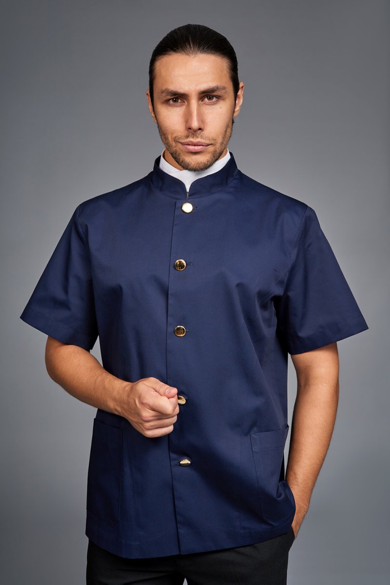 Giacca mod. Greg colori: collo alla coreana 5 bottoni dorati in resina 2 tasche Tessuto 65% poly 35% cotone Lavaggio a 40°C Il modello è alto 183 cm. e indossa tg. 50