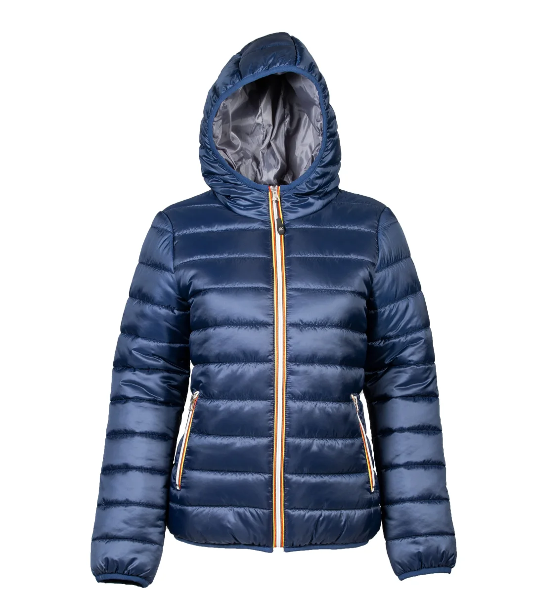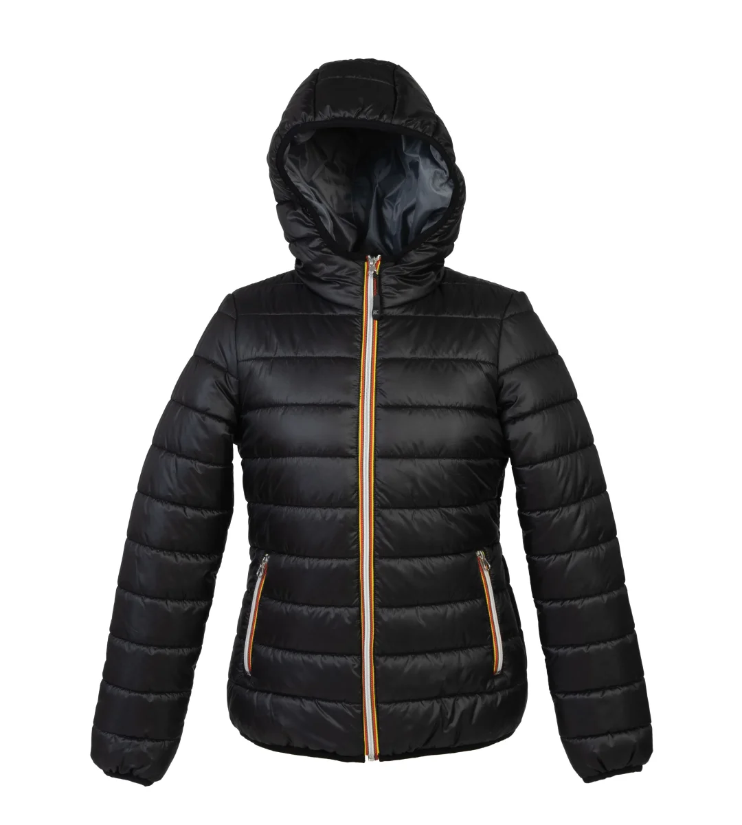 Giubbino donna in nylon morbido, lucido e impermeabile – Fodera morbida in poliestere 300T – Imbottitura in soffice poliestere (effetto piuma) – Cerniera Gialla/Rossa/Nera, cappuccio imbottito con finitura in tessuto elasticizzato. Due tasche con zip, tasca interna portafoglio, tessuto a protezione del mento, polsini e fondo in tessuto elasticizzato.