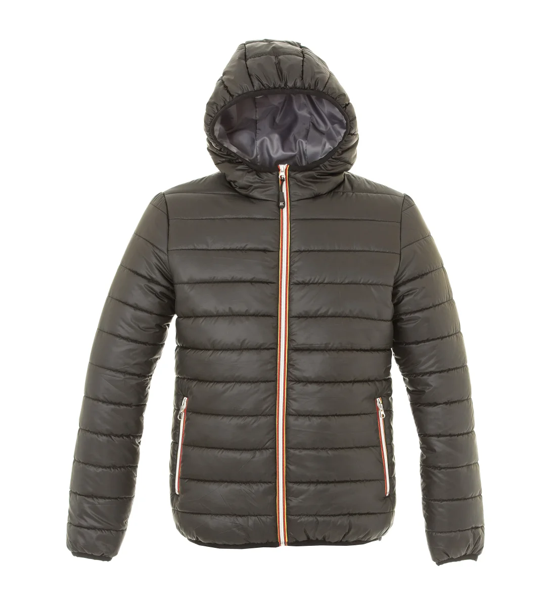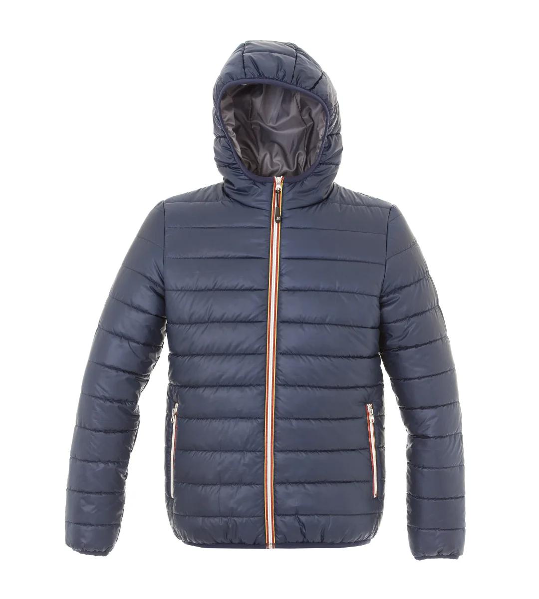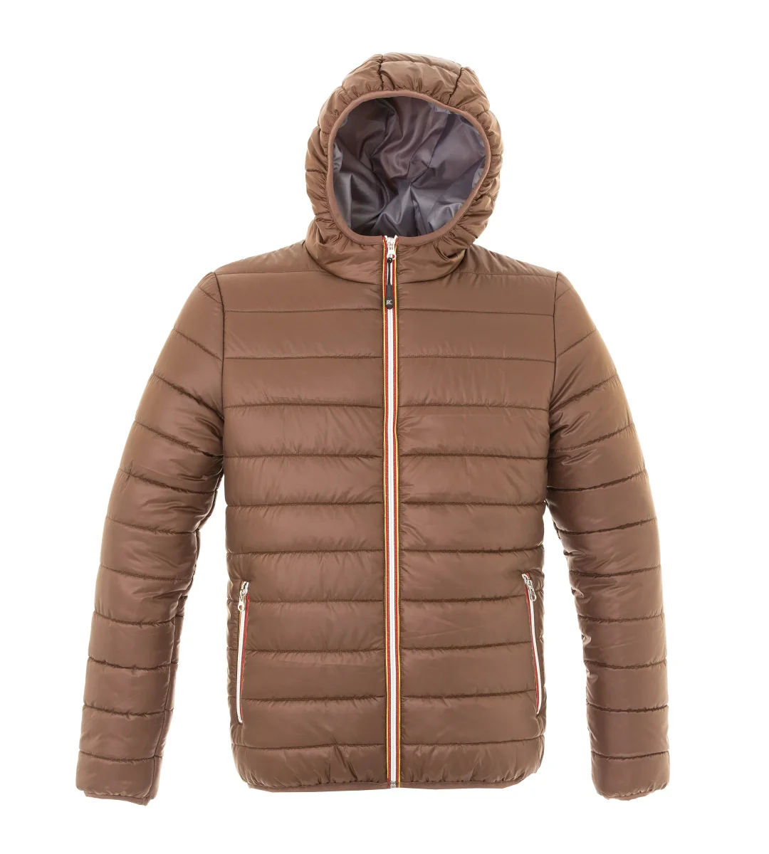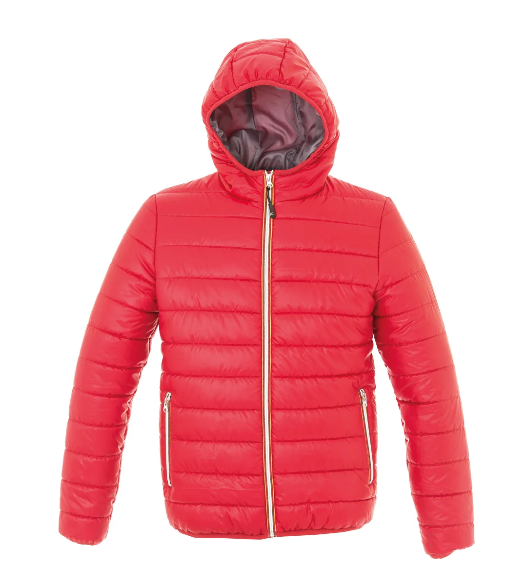 Giubbino in nylon morbido, lucido e impermeabile – Fodera morbida in poliester 300T – Imbottitura in soffice poliestere (effetto piuma), cerniera Gialla/Rossa/Nera, cappuccio imbottito con finitura in tessuto elasticizzato. Due tasche con zip, tasca interna portafoglio, tessuto a protezione del mento, polsini e fondo in tessuto elasticizzato.