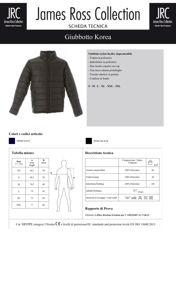 GIACCA IMBOTTITA IMPERMEABILE JRC KOREA UOMO
