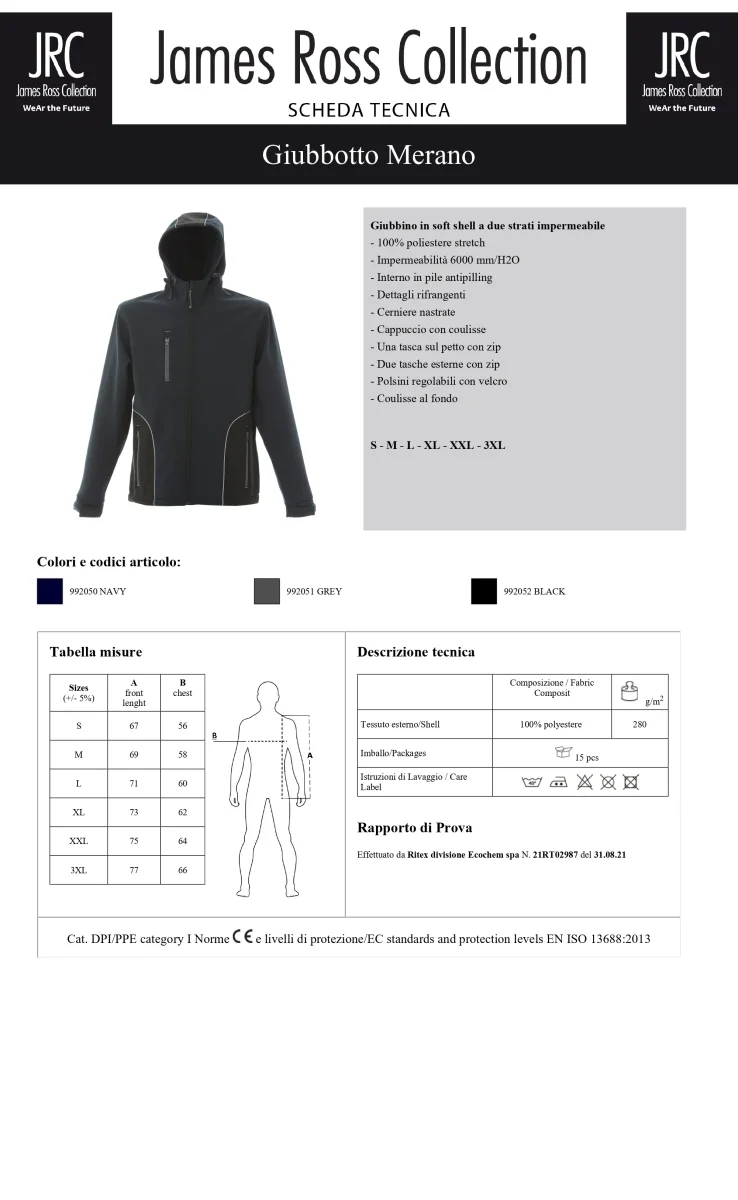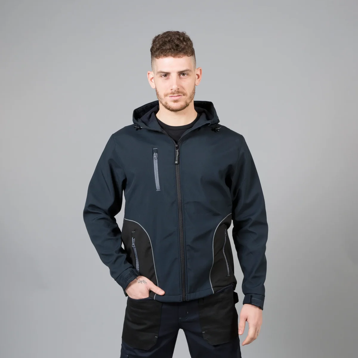Giubbino in soft shell a due strati impermeabile – 100% poliestere stretch – Impermeabilitร 6000 mm/H2O. Interno in pile antipilling, dettagli rifrangenti, cerniere nastrate, cappuccio con coulisse. Una tasca sul petto con zip e due tasche esterne con zip, polsini regolabili con velcro e coulisse al fondo.