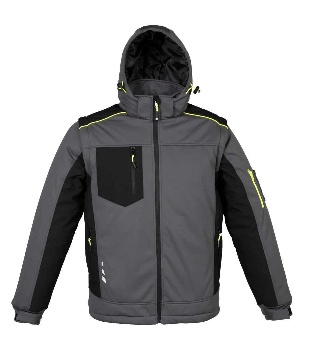 Giubbino in soft shell a 3 strati impermeabile e imbottito – 96% poliestere – 4% elastane – Impermeabilitร 8000 mm/H2O – Traspirabilitร 1000 g/M2/24h. Fodera in poliestere con cuciture verticali, no label, imbottitura in poliestere, stampa rifrangente anteriore, stampa rifrangente postierore sul fianco, piping giallo fluo anteriore sulle spalle e posteriore sulla schiena, maniche staccabili mediante zip coperta, cerniere nastrate. Cappuccio imbottito con coulisse staccabile mediante zip coperta, una tasca sul petto con zip, due tasche esterne con zip, una tasca con zip sul braccio e doppio portapenne e una tasca interna portafoglio con velcro, tessuto a protezione del mento con logo 4STRETCH, polsini elastici regolabili con velcro e coulisse al fondo