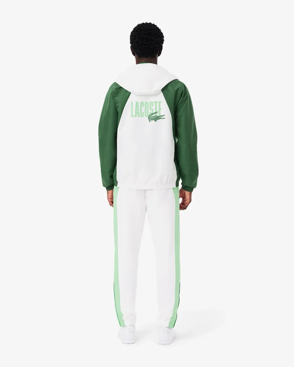 La moda incontra lo sportswear in questa tuta dalle classiche caratteristiche Lacoste. È realizzata nel nostro iconico taffetà a rombi leggero e traspirante per la massima libertà di movimento, con un sorprendente design color block e una stampa tradizionale. Competenza tecnica e stile distintivo, dentro e fuori dal campo.