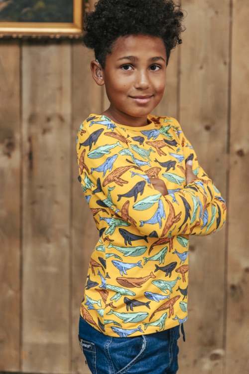 Villervalla autunno ci accompagna dolcemente verso l’inverno, con tanta fantasia e dolci coccole – senza mai dimenticare i colori vibranti che tutti amiamo! Maglietta a manica lunga con delle balene che nuotano sullo sfondo giallo zafferano