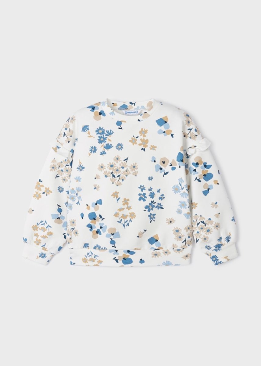felpa manica lunga per bambina con volant sulle spalle. Girocollo. Stampa con decorazione floreale.