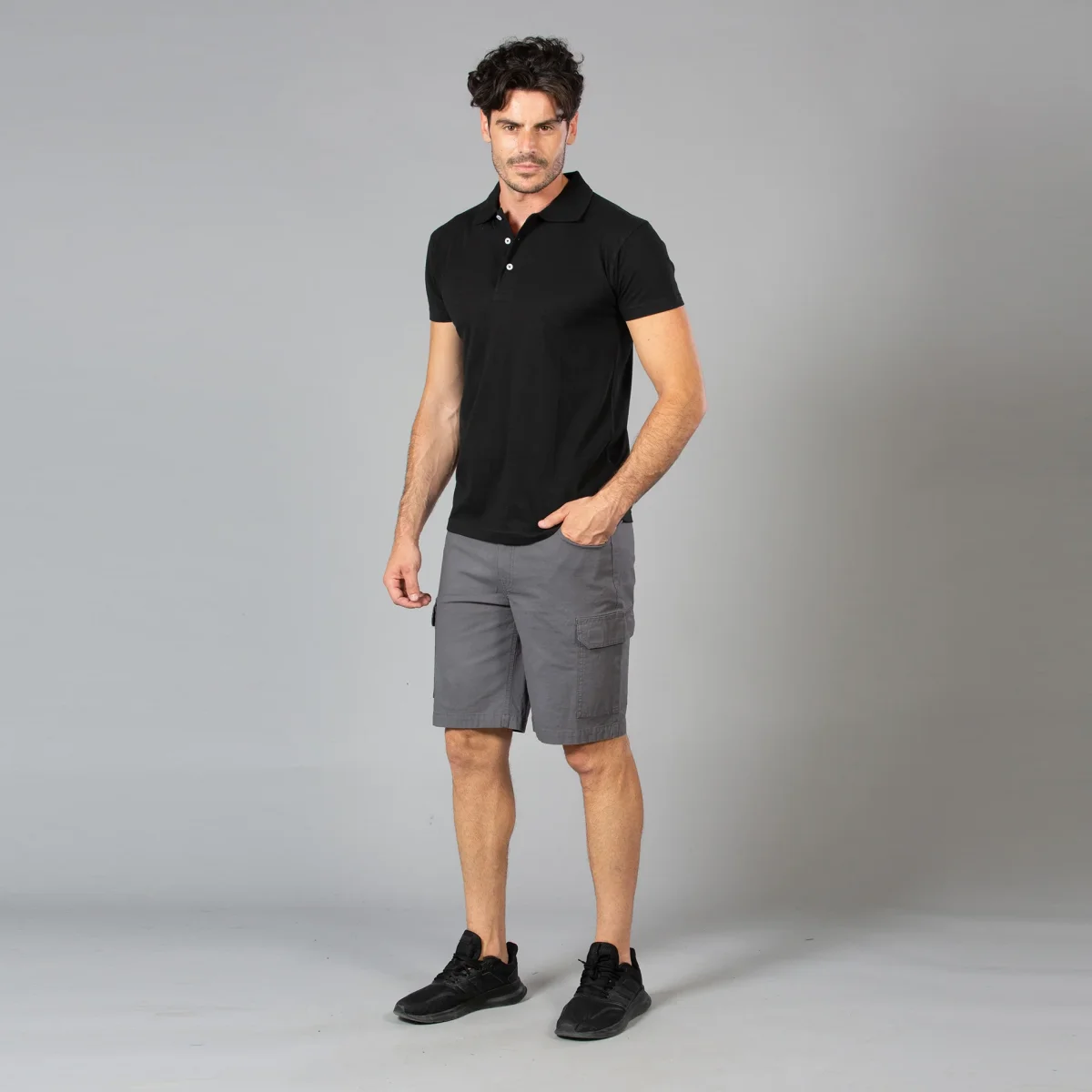 Pantalone corto multitasche elasticizzato – 98% cotone โ 2% elastan. Lavorazione Ripstop, tessuto prelavato, elastici in vita sui fianchi, bottone centrale in metallo. Due tasche anteriori, due tasche laterali con velcro e una tasca posteriore con velcro.