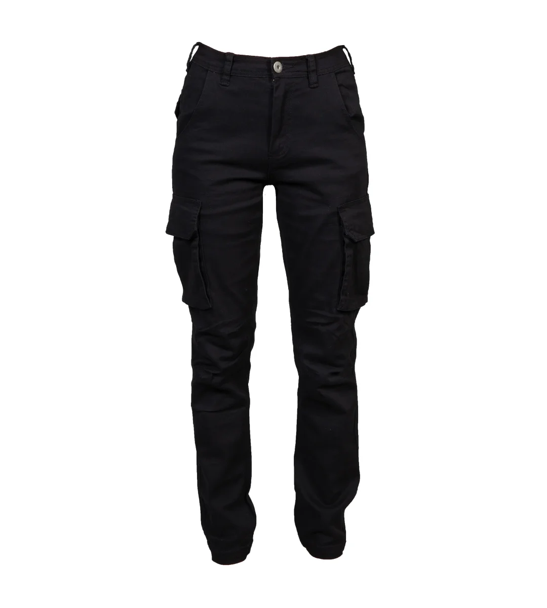 Pantalone donna multitasche elasticizzato – 98% cotone โ 2% elastan – Tessuto prelavato. Due tasche anteriori, due tasche laterali con bottoni automatici coperti, due tasche posteriori con bottoni automatici coperti e cucitura sulle ginocchia per maggior comfort