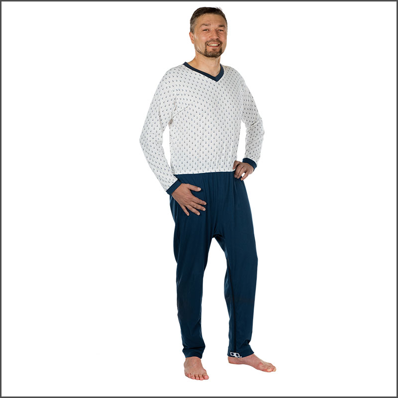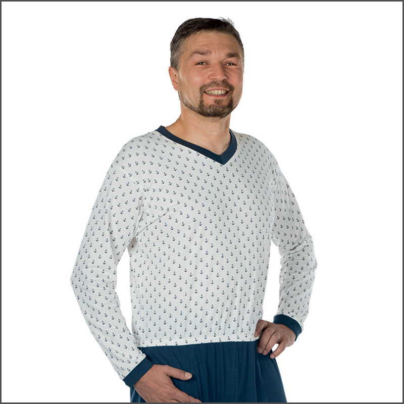 PIGIAMA INTERO ESTIVO cioè con manica lunga e gamba intera in tessuto di maglina sottile 100% cotone, con un morbido elastico in vita. E’ realizzato con la parte superiore con scollo a V in simpatica fantasia con piccole ancore su fondo bianco, e la parte inferiore, cioè i pantaloni, di colore blu Disponibile nel modello da Uomo, […]