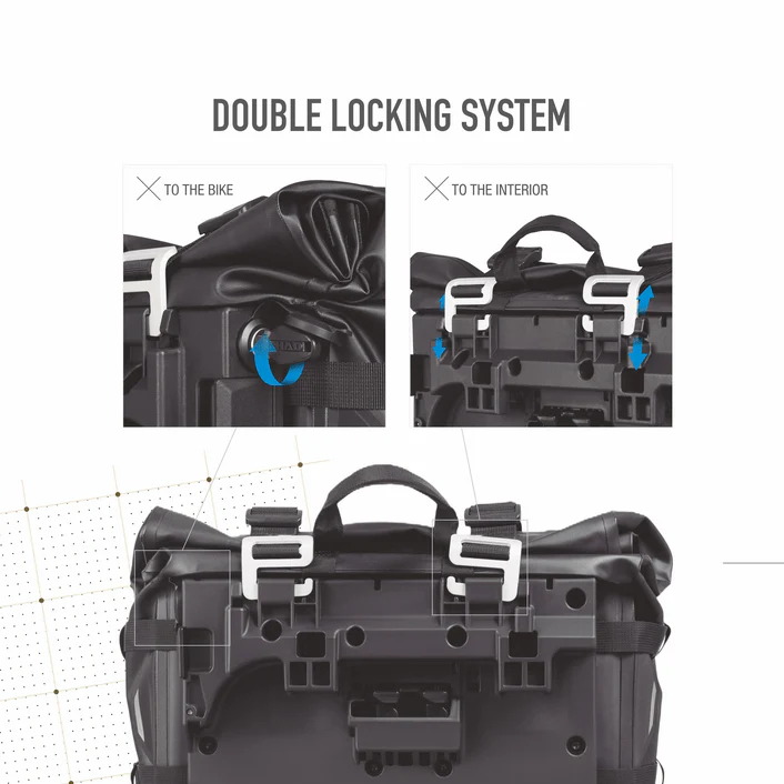 Le borse laterali Adventure TR30 si distinguono per il grado di impermeabilità IPX6 e il sistema di chiusura “Double Locking System” (in attesa di brevetto) per bloccare la borsa sui fissaggi 4P e 3P System e impedire, allo stesso tempo, l’accesso al suo interno.