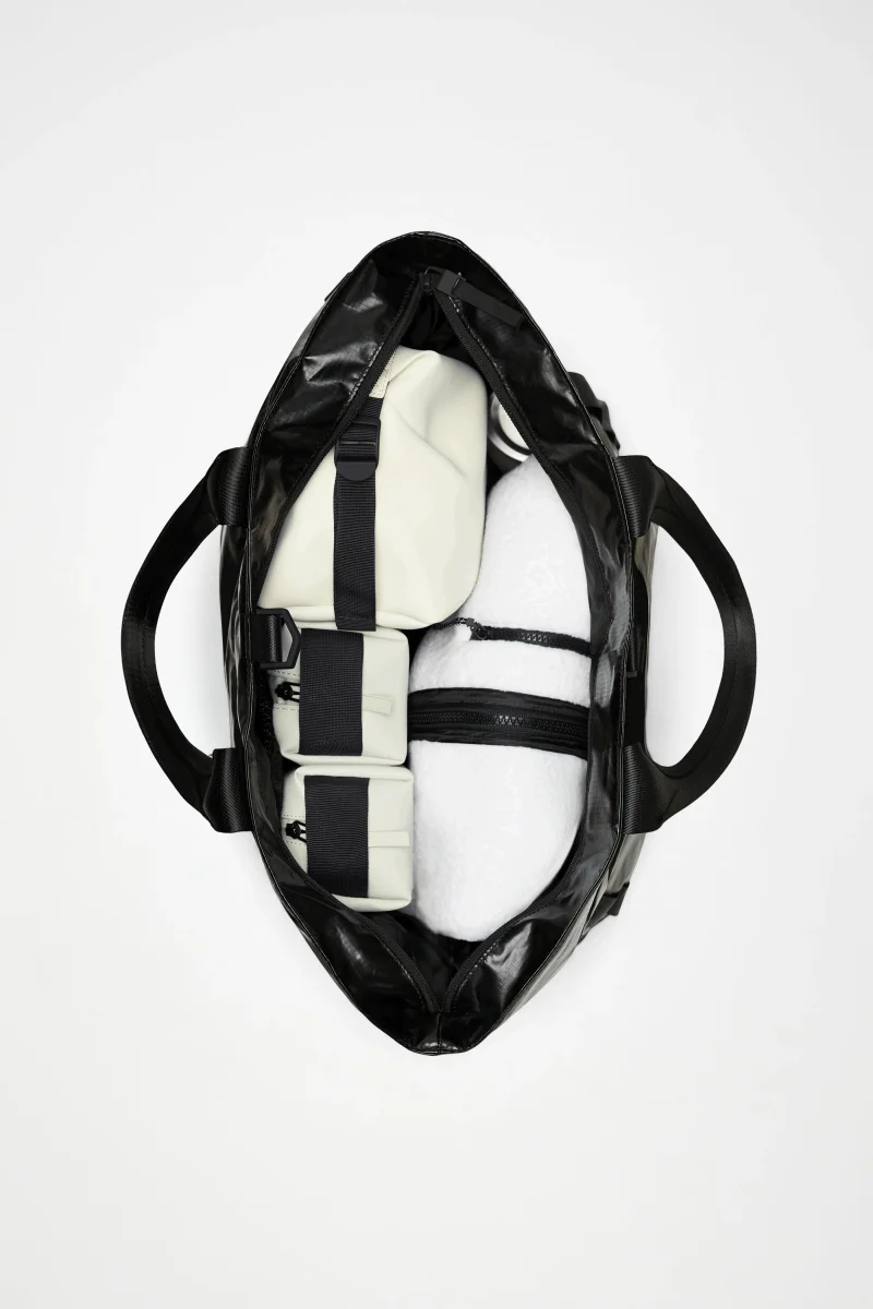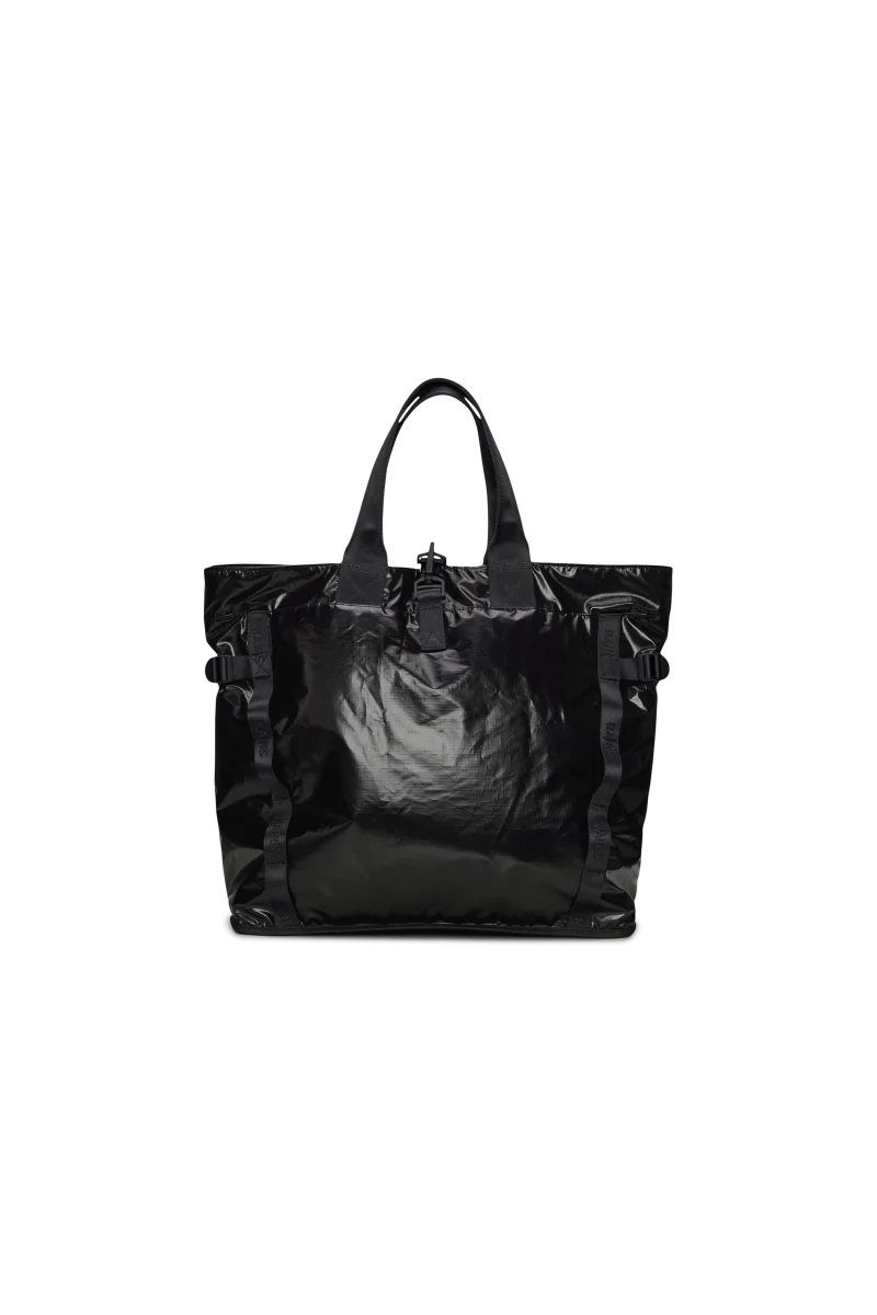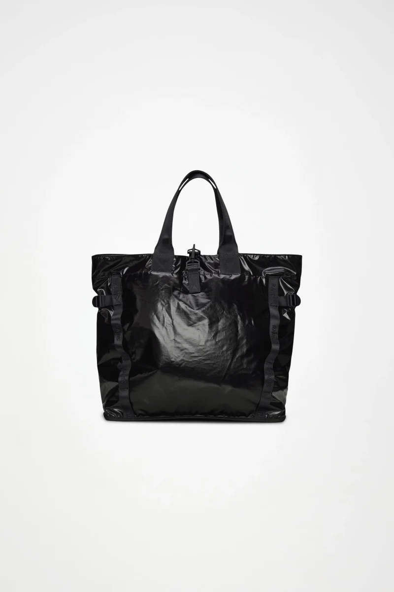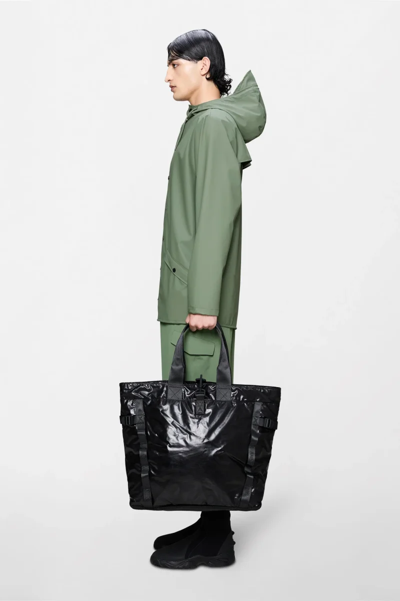 La Sibu Shopper Bag è realizzata in poliestere tecnico Rains con un rivestimento in TPU impermeabile. Il design è elegante, leggero e particolarmente resistente
