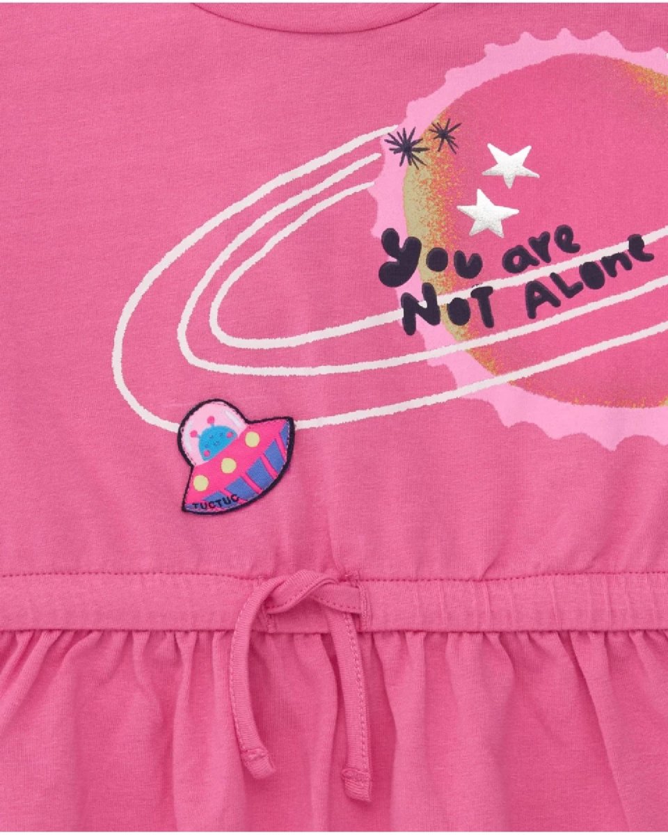 Blusa a maniche lunghe per bambina di colore rosa, realizzata in morbido tessuto di maglia. Presenta una stampa spaziale con un pianeta, stelle e la frase “You are not alone” in tonalità brillanti, accompagnata da un piccolo disco volante ricamato. Il design include una cintura elastica con fiocco decorativo e un volant sul fondo che dona un tocco femminile e divertente. Chiusura con bottoni sulla spalla per facilitare la vestizione.