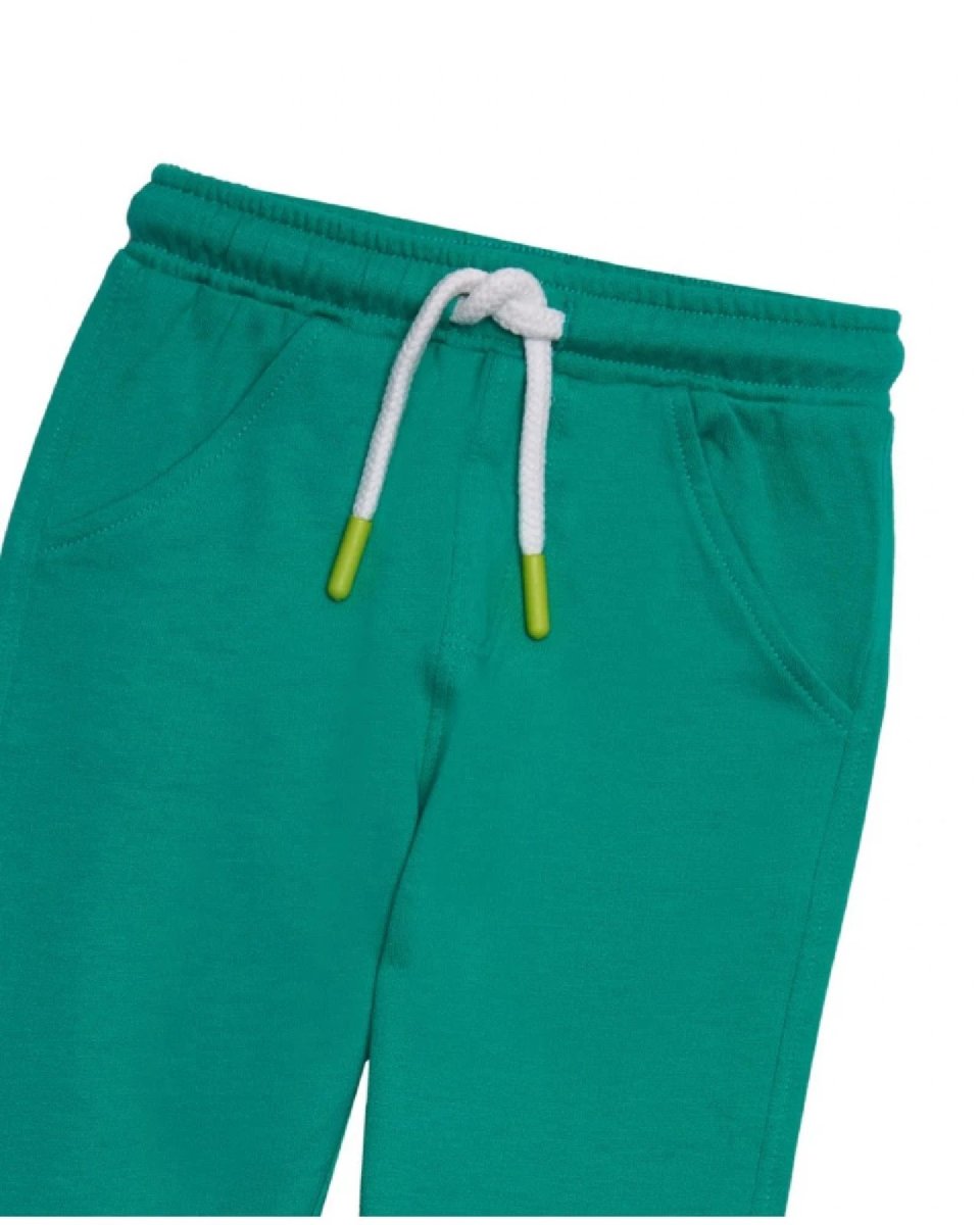 Completo felpa e pantaloni per bambino in blu navy e verde. Felpa con stampa di navicella spaziale davanti e mostro cosmico con scritta “COSMIC” dietro. Pantaloni comodi con vita elastica.
