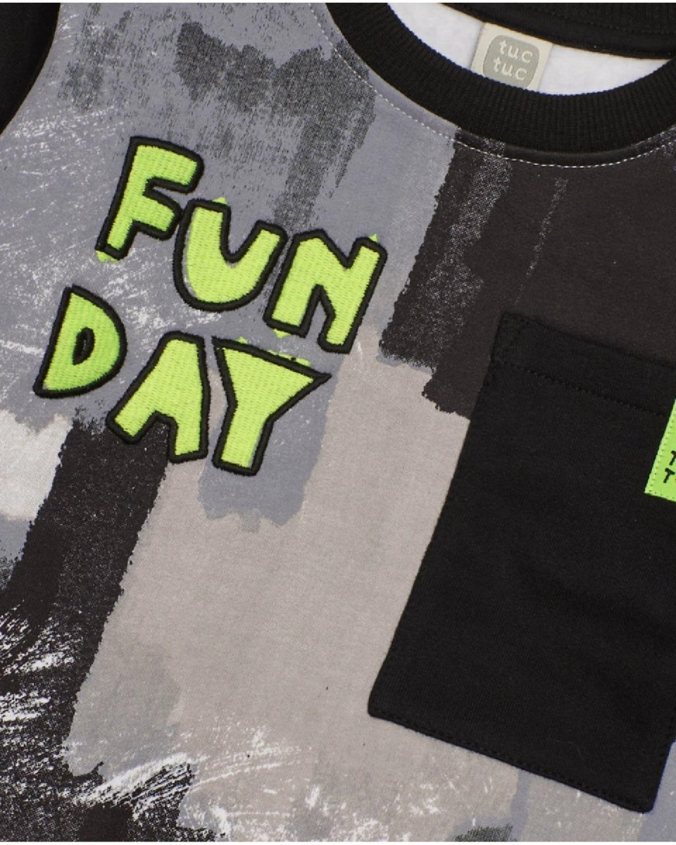 Completo a due pezzi per bambino in felpa. Felpa nera con stampa effetto pennellata in tonalità di grigio e scritta “FUN DAY” in verde. Tasca applicata sul petto e bottoni sulla spalla. Pantaloni neri con vita elasticizzata, ginocchia imbottite e dettaglio con zip verde su un lato.