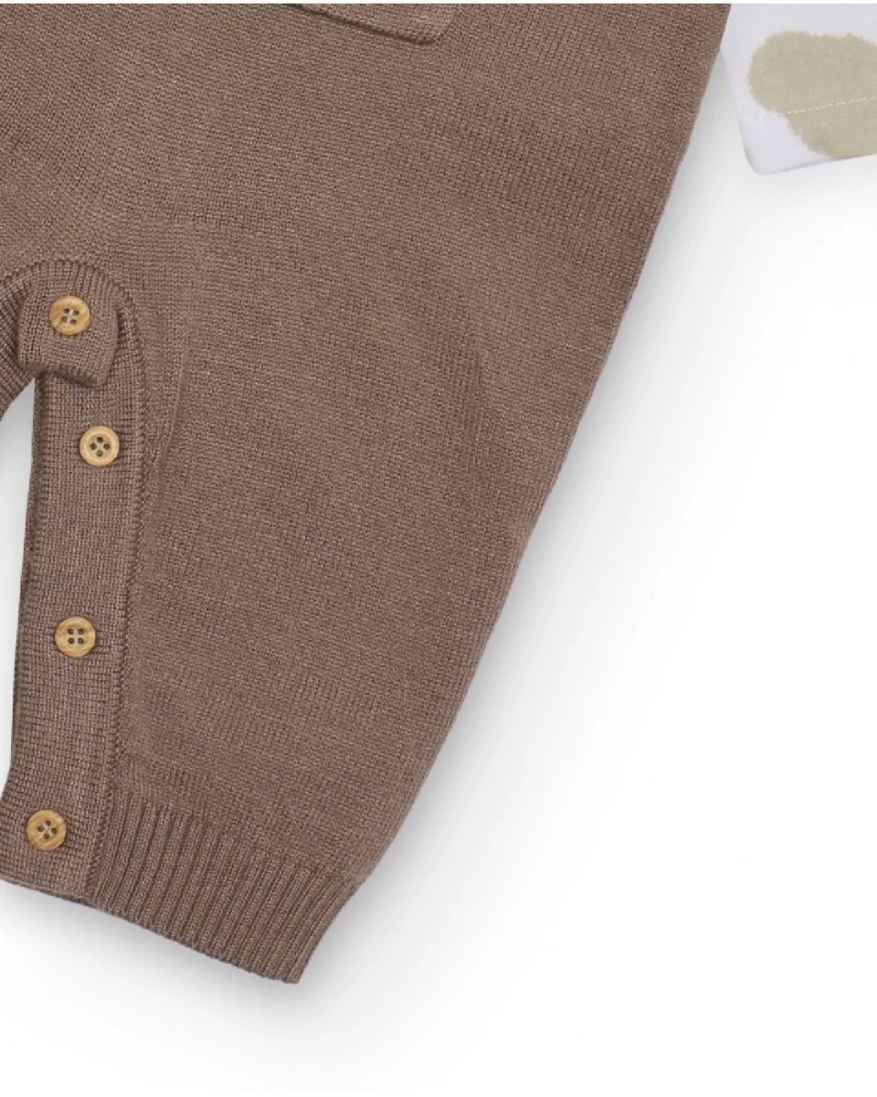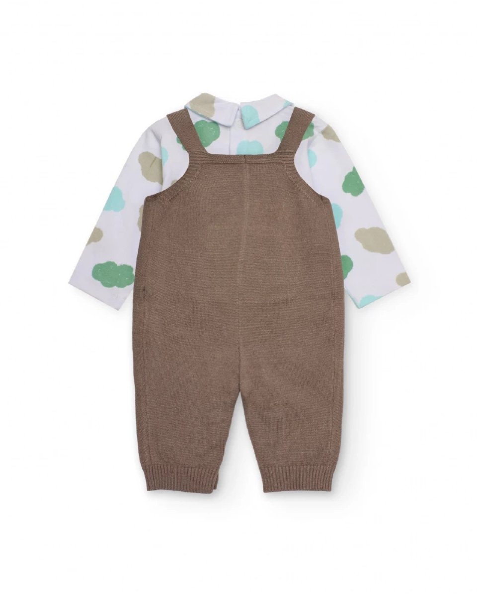 Completo per neonato composto da una salopette in maglia di colore marrone con bretelle con bottoni e tasca centrale tipo marsupio. La maglietta a maniche lunghe bianca è decorata con una deliziosa stampa di nuvolette nei toni verde acqua e beige, e presenta un colletto classico. La salopette è dotata di bottoni sul cavallo per facilitare il cambio del pannolino, offrendo comfort e un look tenero per ogni occasione.