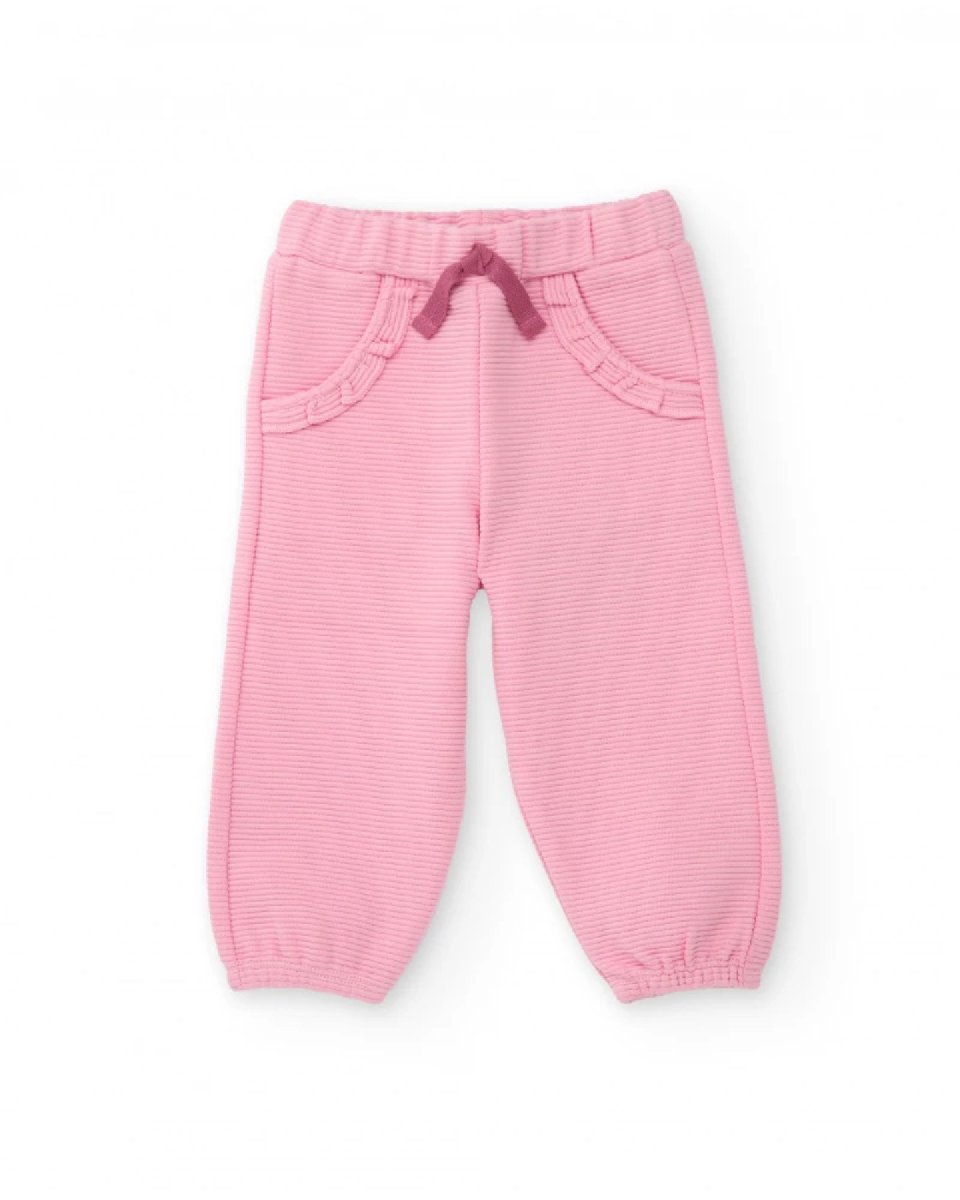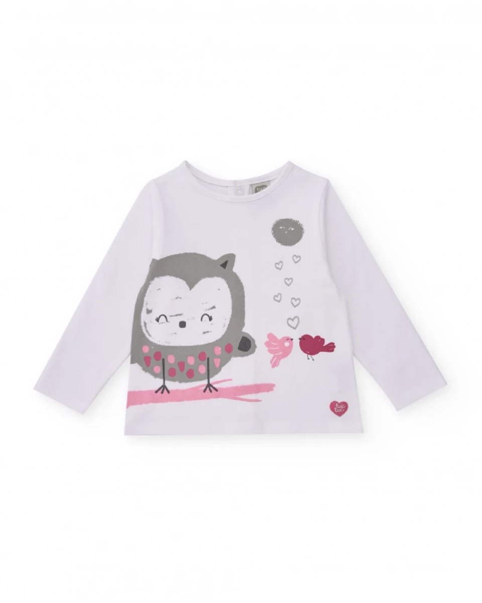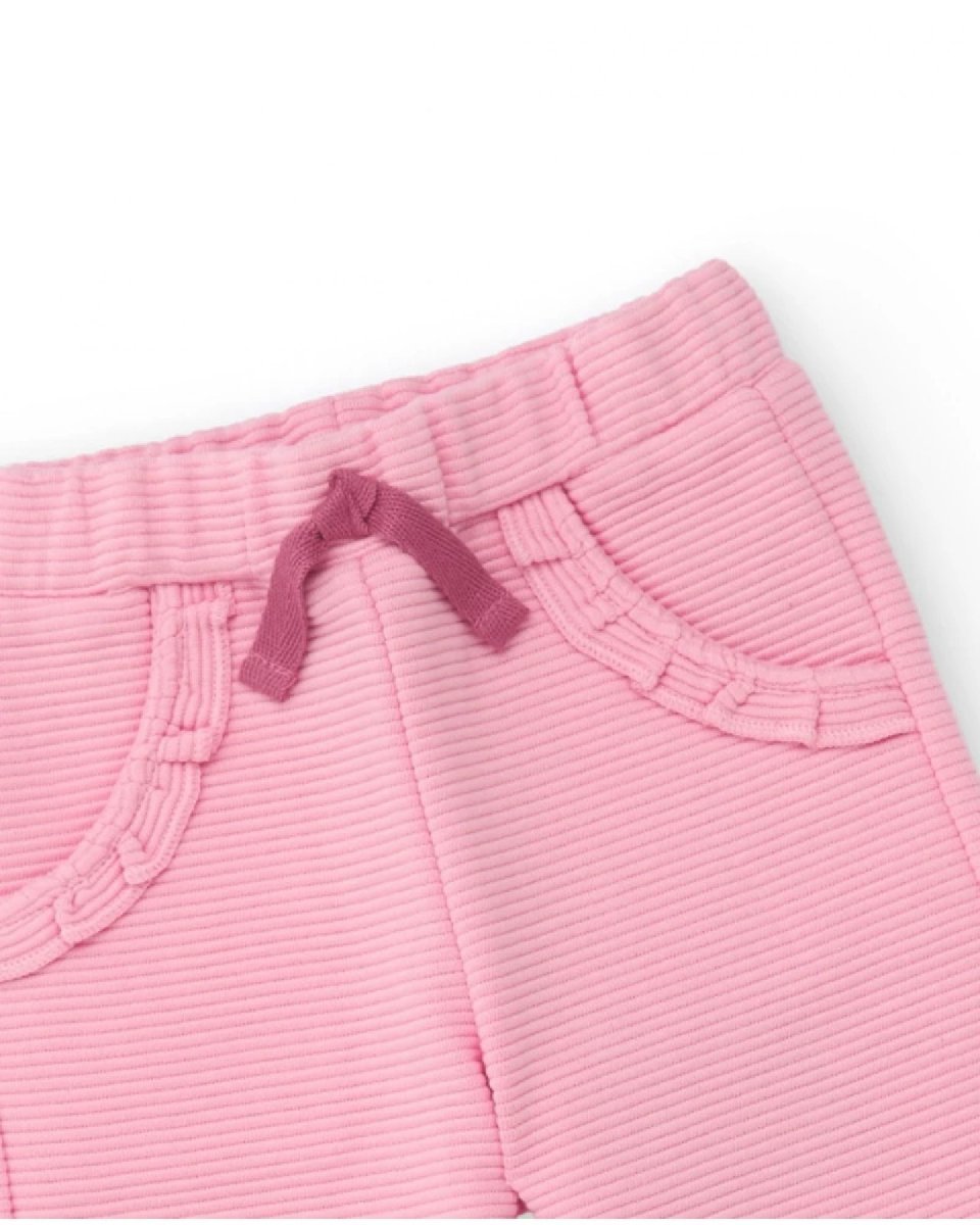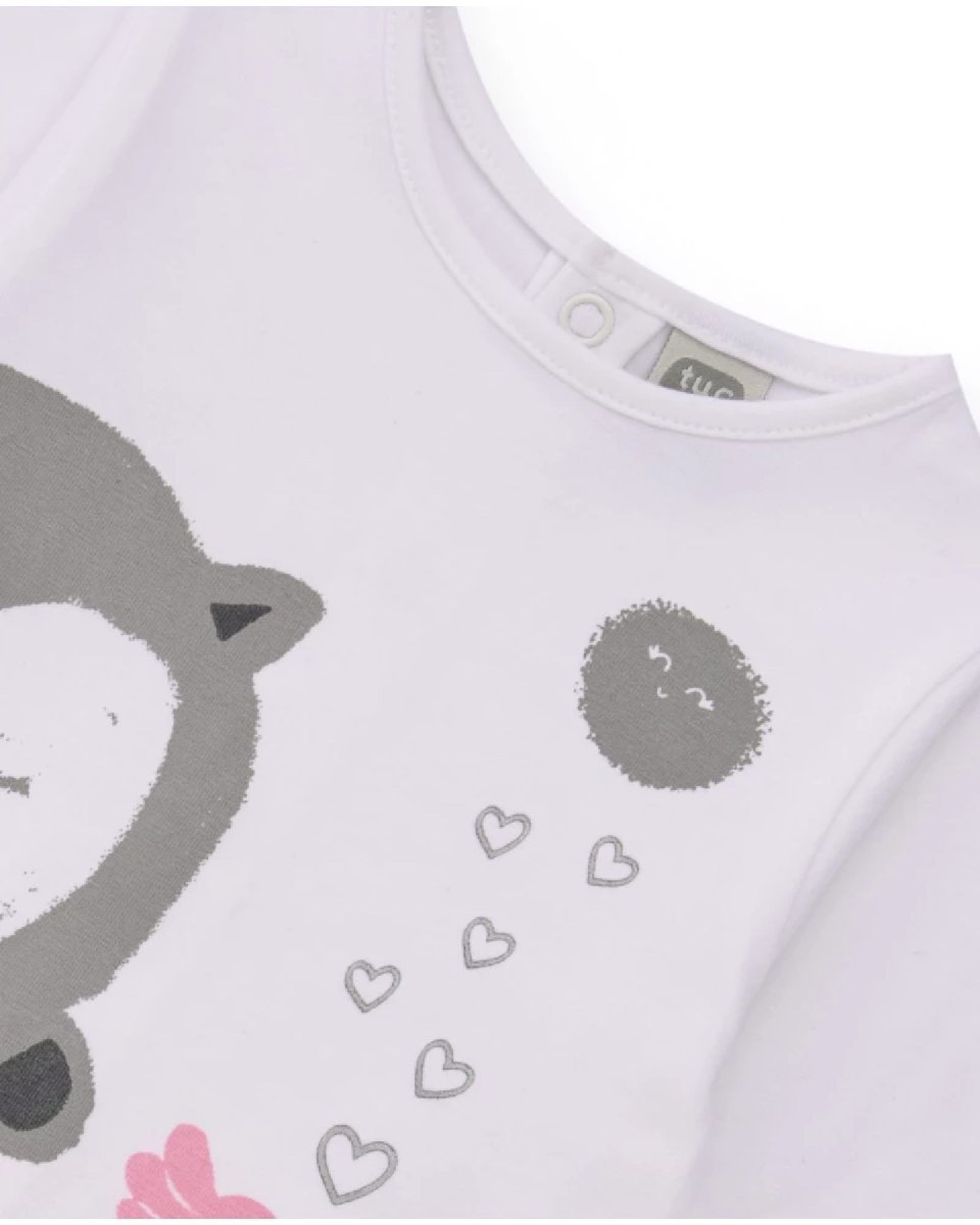 Completo tre pezzi per bambina con giacca, t-shirt e pantaloni in tonalità rosa e bianco. La giacca a maniche lunghe ha una texture a coste, volant decorativi sulle spalle e chiusura frontale con zip, con applicazioni di uccellini. La t-shirt a maniche lunghe con scollo rotondo presenta una simpatica stampa di gufo con cuori. I pantaloni abbinati sono comodi con vita elastica e piccoli volant sulle tasche.