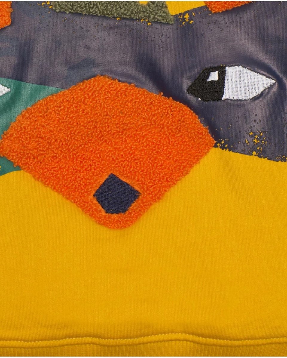 Felpa in pile color senape vivace per bambino con design originale di dinosauro a texture mista e dettagli in rilievo. Collo, polsini e orlo a costine, bottoni automatici sulla spalla.