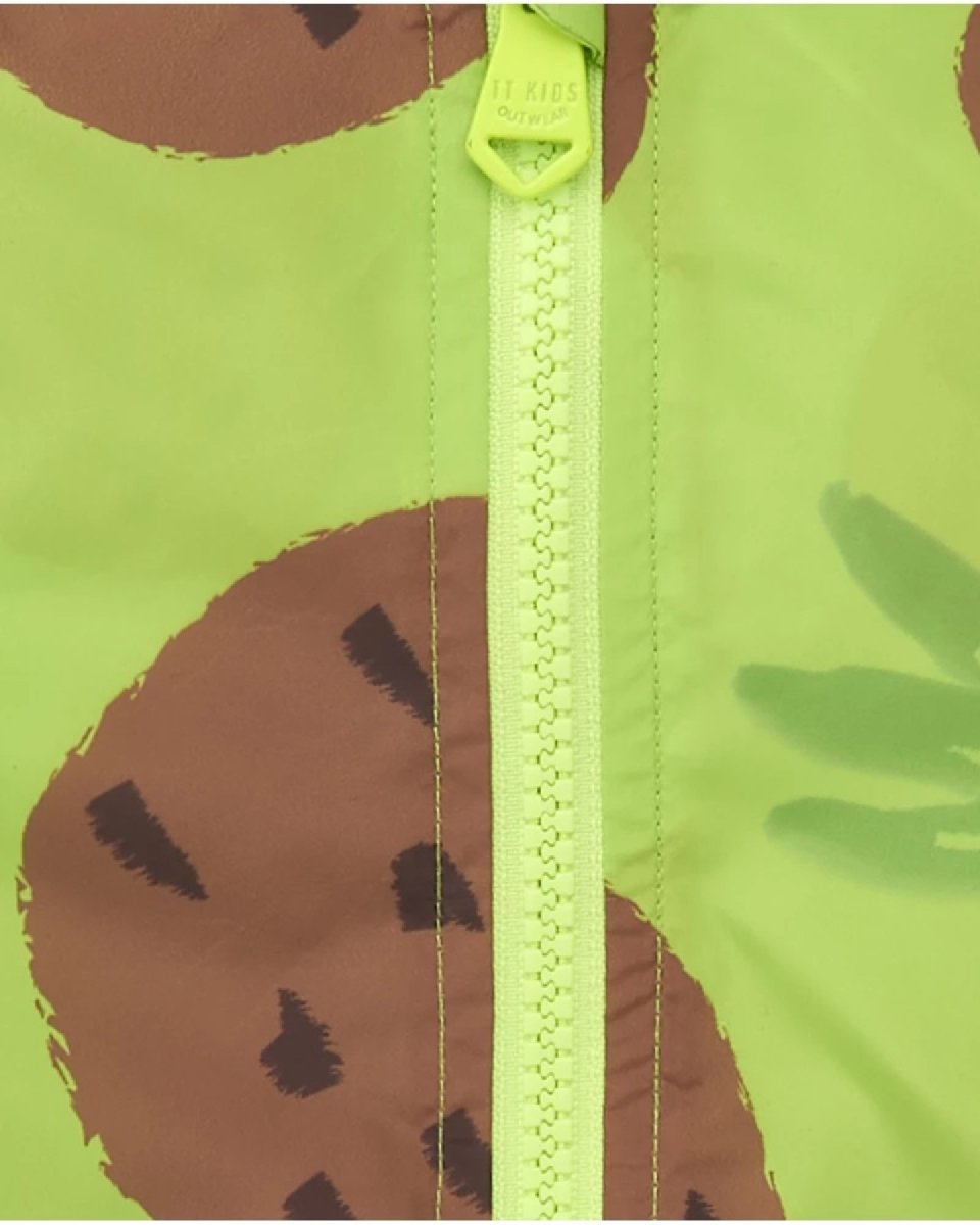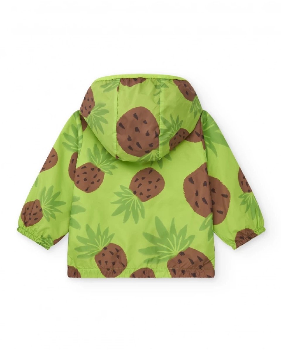 Giacca a vento per bambino di colore verde con stampa di ananas tropicali. Realizzata in materiale leggero e resistente al vento, con cappuccio integrato e chiusura a zip per maggiore praticità. Poliestere 100%