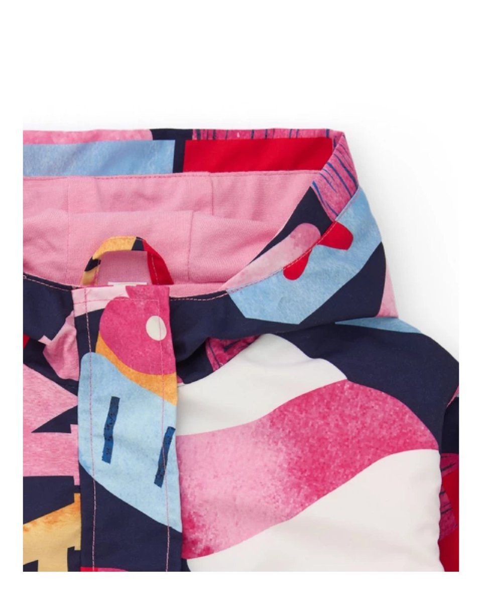 Giacca imbottita per bambina con stampa multicolore di lettere, cuori e stelle in rosso, blu, rosa e giallo. Cappuccio foderato in rosa chiaro, zip frontale sotto patta con bottoni a pressione e tasche frontali con patta. Polsini elasticizzati per trattenere il calore. Un capo vivace e divertente per l’inverno.