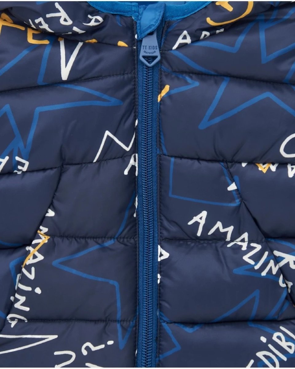 Parka tecnico per ragazzi in blu navy, realizzato in materiale trapuntato per offrire calore e comfort. Presenta una stampa grafica con parole e stelle in colori contrastanti, che aggiunge un tocco dinamico al design. Il parka include cappuccio e chiusura frontale con cerniera per una protezione aggiuntiva dal freddo. Ideale per le giornate fredde, questo capo offre funzionalità e stile. Fa parte della collezione Amazing.