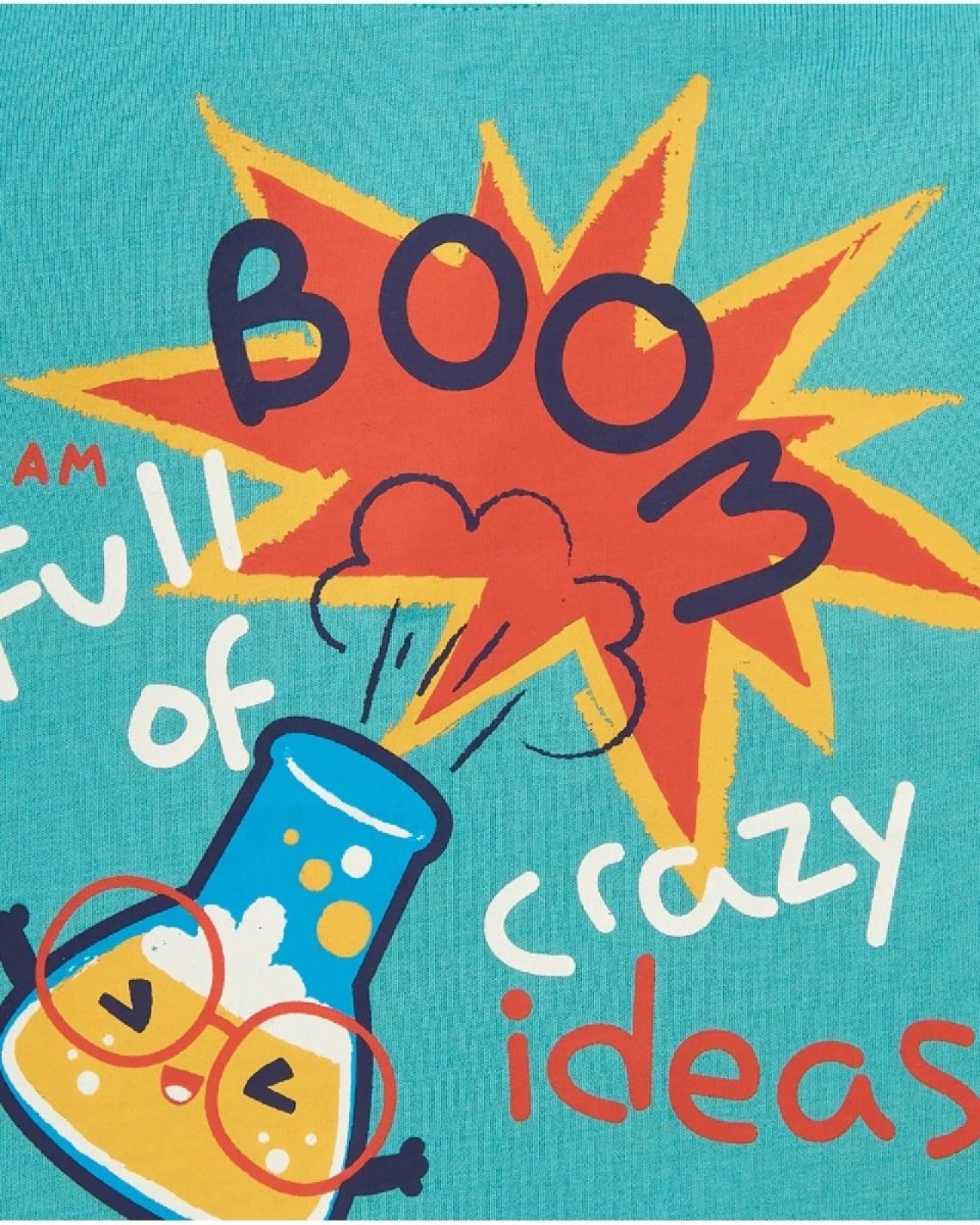 T-shirt a maniche lunghe per ragazzi in turchese, progettata con una divertente stampa frontale che include una grafica colorata di un esperimento scientifico e la frase “Boom! Sono pieno di idee folli”. Realizzata in un tessuto morbido e confortevole, questa t-shirt รจ perfetta per i piรน piccoli pieni di energia e creativitร . Il design include bottoni sulla spalla per vestirsi e svestirsi facilmente, garantendo comfort ad ogni utilizzo. Ideale da abbinare a pantaloni o joggers, รจ un capo che si distingue per originalitร e stile. Appartiene alla collezione Big Brains